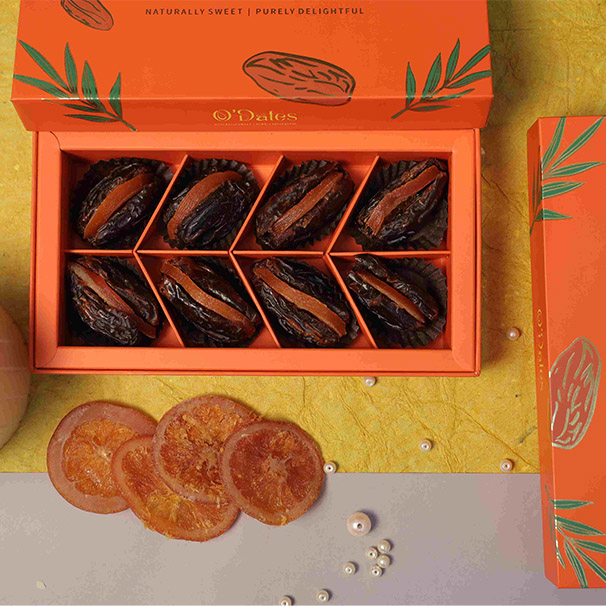 Experience a burst of delightful flavors with Orange Delight Medjoul dates enhanced by the tanginess of orange peel. These premium dates, celebrated for their juicy and tender texture, are meticulously filled with Candied Oranges. The natural sweetness of the dates perfectly complements the citrusy brightness of the orange, creating a delectable treat that's both refreshing and indulgent. Ideal for a gourmet snack or a refined addition to any dessert spread, these stuffed dates offer a unique and sophisticated taste sensation that captivates the palate.