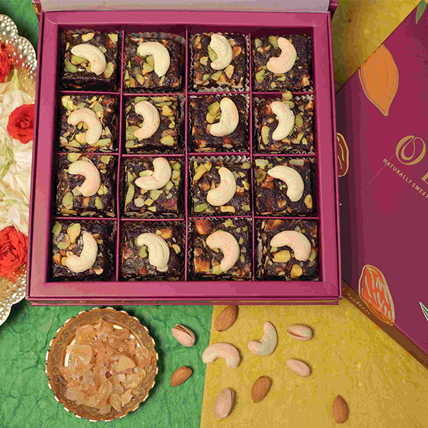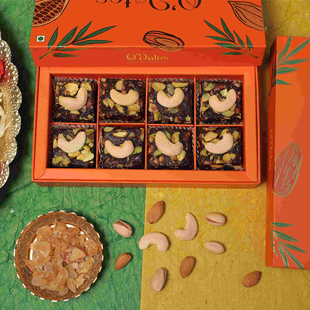 Satisfy your cravings guilt-free with our Handmade Dates Gond Burfi, a delectable fusion of natural goodness. Crafted with care, enriched with premium nuts and black dates, every bite offers a symphony of flavours and textures. Our Dates Gond Burfi is different! The texture, taste, and colour are that of the natural dates loaded with wholesome nuts. We are able to provide you this because we refrain to add sugars, glucose, colours, and preservatives to our Dates Gond Burfi. So go ahead and Experience the joy of authentic, handmade goodness in every delectable piece of our Dates Burfi – a delightful treat that's as pure as nature intended.